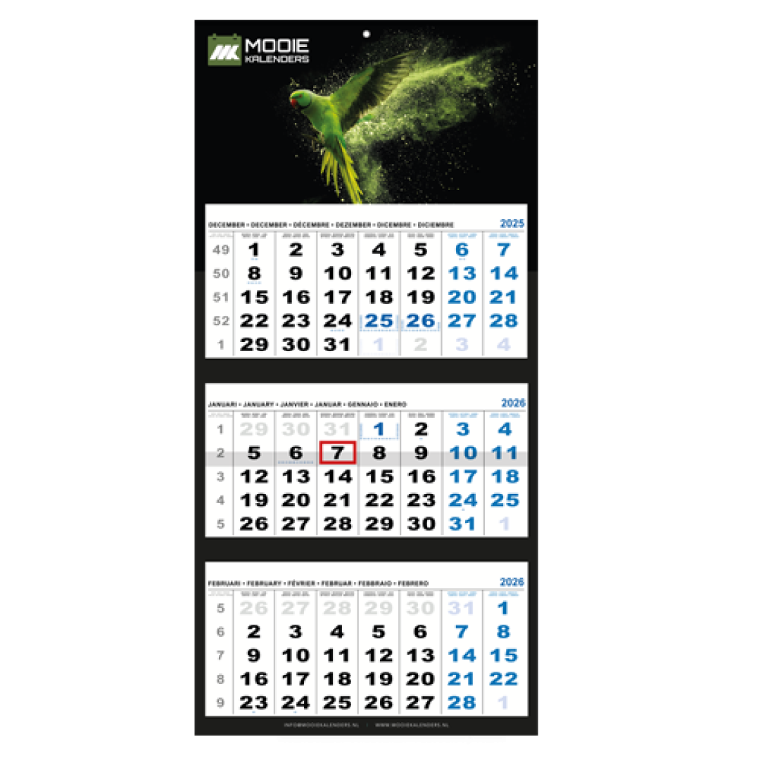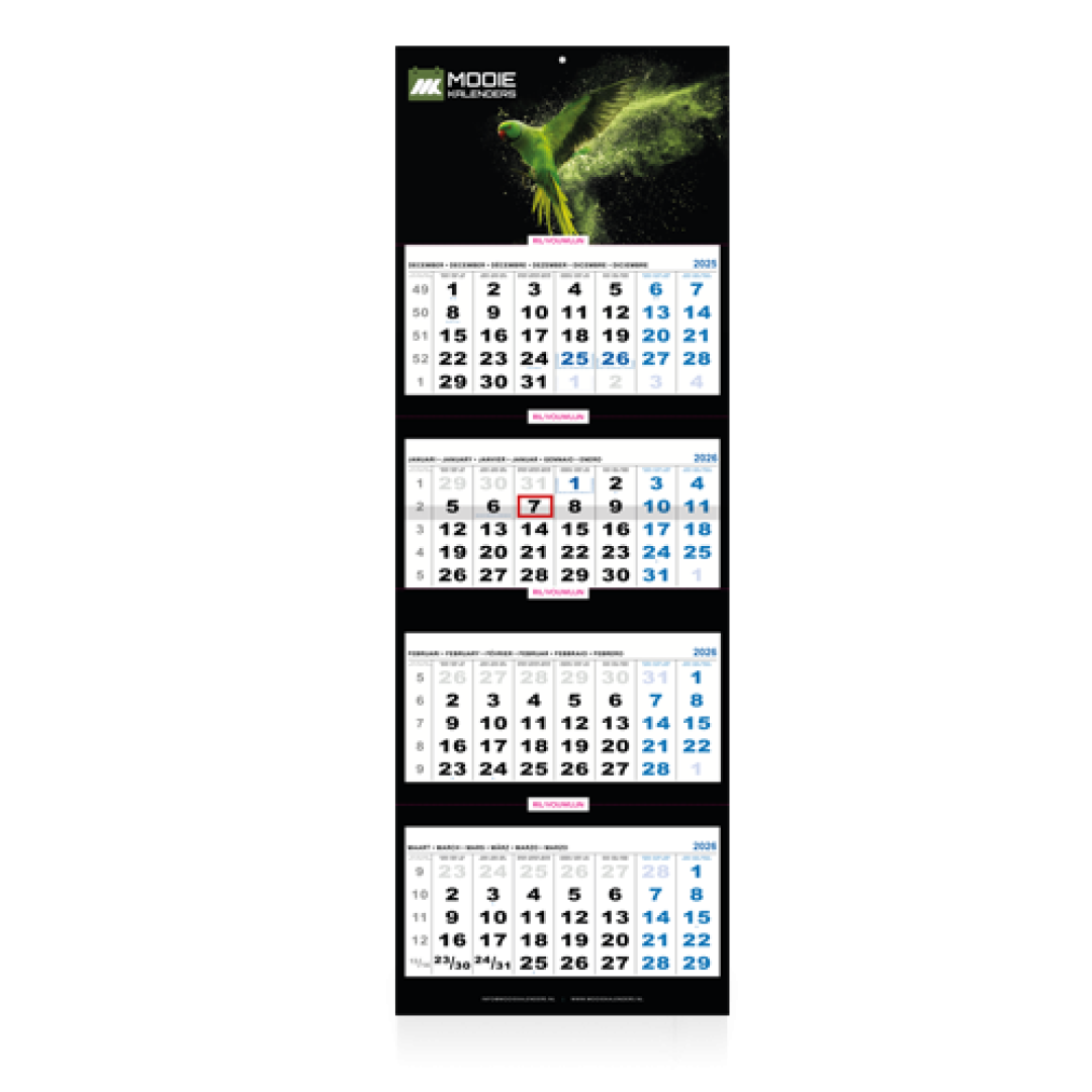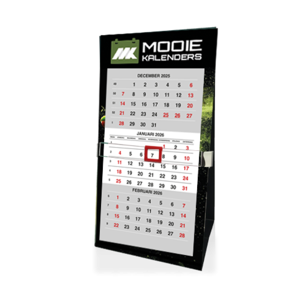 De favoriet bij veel van onze klanten. Jaarlijks vinden duizenden ‘kwartaalkalenders’ hun weg naar diverse relaties. Planners, magazijnen, ziekenhuizen en vele afdelingen logistiek worden gesierd door deze hangende 3-maandskalenders. Een geschenk dat zeker een jaar lang een prominente plaats bij je relaties zal innemen.